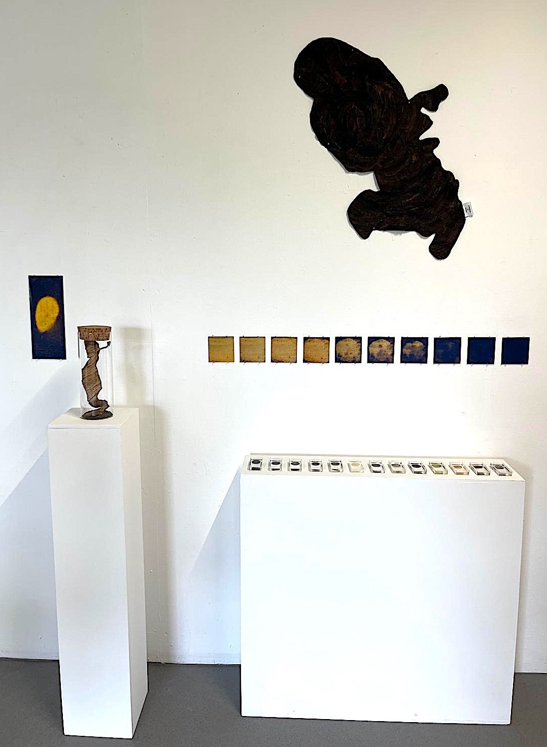 En 2014, la démarche s’épure, le liant disparait progressivement. l’opération plastique se limite à la transformation de la matière végétale et sa mise en scène pour en révéler des caractéristiques, texture, couleur … et créer une forme de confusion du regard : végétal, animal, minéral, matière synthétique ?
